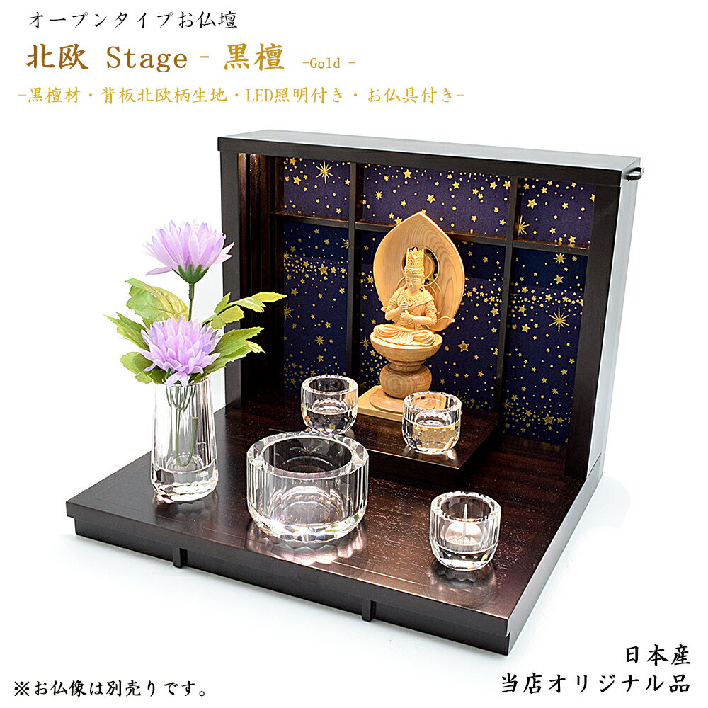 【手元供養品】ミニ仏壇「星に願いを」GOLDタイプ★仏具付き★LED照明付き※黒檀製 ※正面-北欧風デザイン生地仕様◆日本製仏壇ステージ仏壇 手元供養台 ステージ型仏壇 メモリアルステージ オープンタイプ仏壇 モダン仏壇 ペット供養 北欧