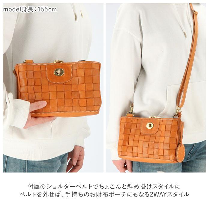本格レザーをバスケットのように編み込んだ素材使いが可愛い!これ一つでサッとお出掛けできる、便利な「お財布機能付きショルダーバッグ」。