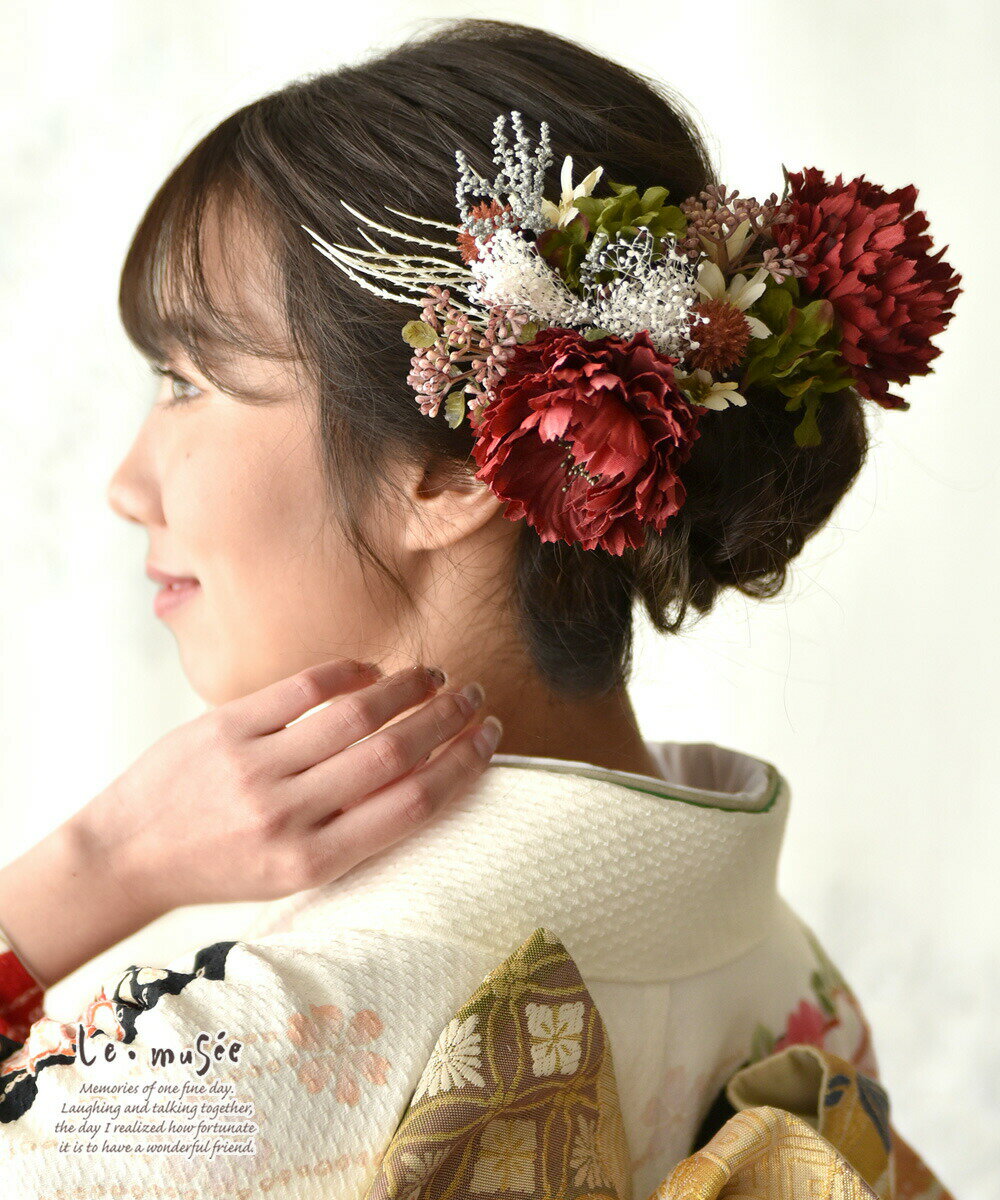 ヘッドドレス アンティークガーベラ ルナ 商品詳細 ■ 商品名:ヘッドドレス アンティークガーベラ ルナ ■ 商品番号:020163120 ■ 花材・サイズ: ◆黄色◆ ・ガーベラ約8cm × 2輪 アーティフィシャルフラワー(造花) ・みもの × 2パーツ アーティフィシャルフラワー(造花) ・みものブルー × 3パーツ アーティフィシャルフラワー(造花) ・あじさい × 2パーツ アーティフィシャルフラワー(造花) ・アイボリー小花 × 5輪 アーティフィシャルフラワー(造花) ・シーブッシュ × 2パーツ ・カスミソウ × 3パーツ プリザーブドフラワー ・スト—ベ × 2パーツ プリザーブドフラワー ◆葡萄◆ ・ピオニー約7cm × 2輪 アーティフィシャルフラワー(造花) ・みもの × 2パーツ アーティフィシャルフラワー(造花) ・みものブルー × 3パーツ アーティフィシャルフラワー(造花) ・あじさい × 2パーツ アーティフィシャルフラワー(造花) ・アイボリー小花 × 5輪 アーティフィシャルフラワー(造花) ・シーブッシュ × 2パーツ ・カスミソウ × 3パーツ プリザーブドフラワー ・スト—ベ × 2パーツ プリザーブドフラワー ■ 素材:※アーティフィシャルフラワー(造花・シルクフラワー), プリザーブドフラワー ピック仕上げ 【ワンランク上のヘアスタイルコーディネート】 オプションの髪飾りパーツと組み合わせて、こんなアレンジも可能です♪