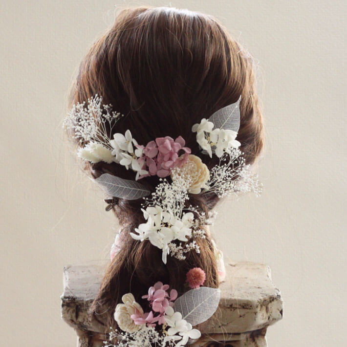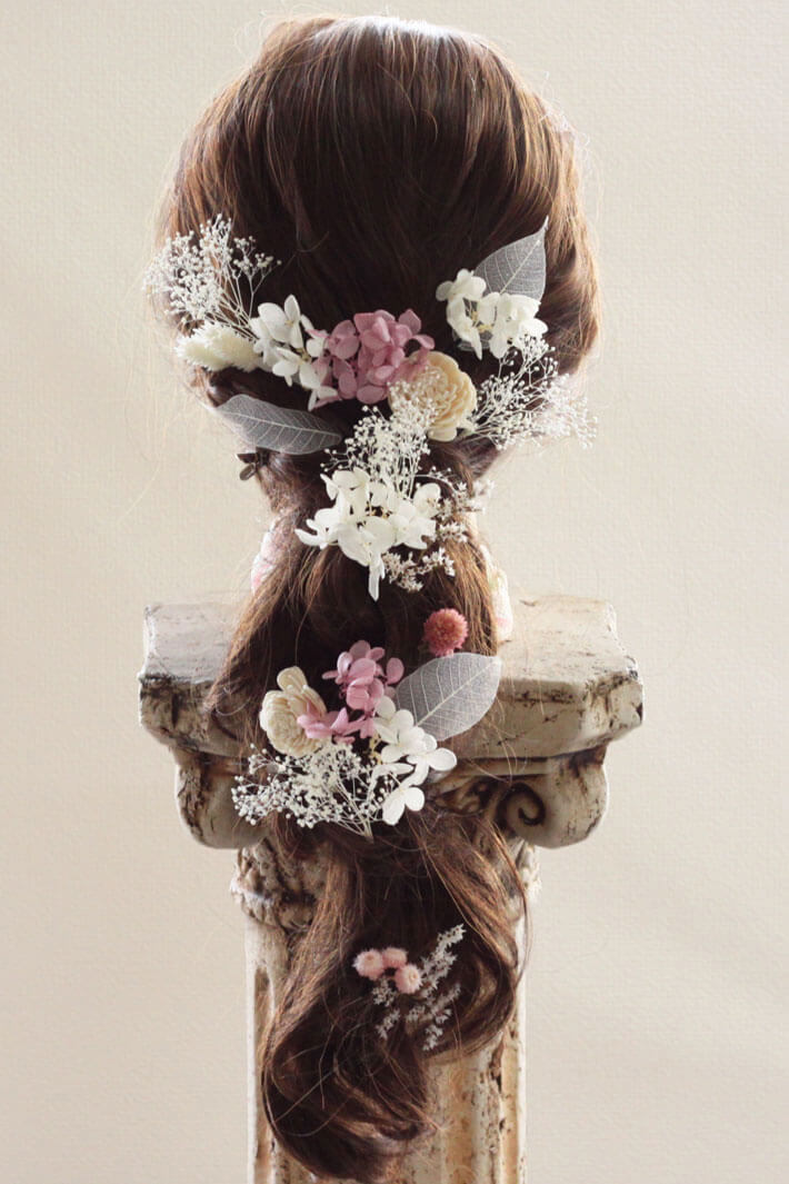 お花にはワイヤーが付いてヘアに自在にアレンジができます。