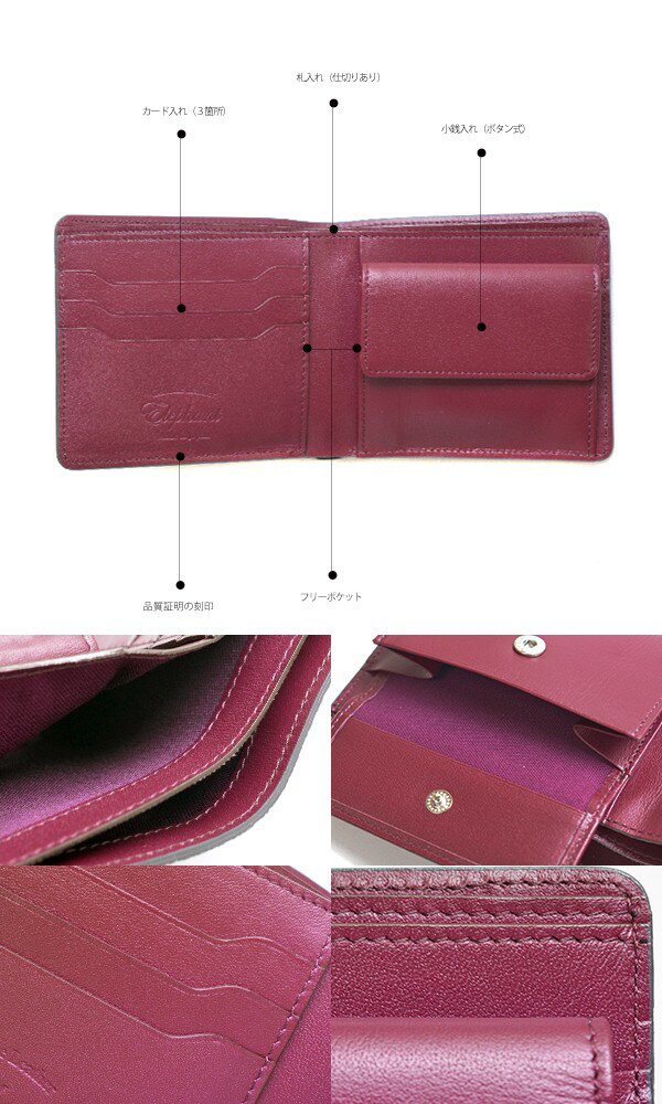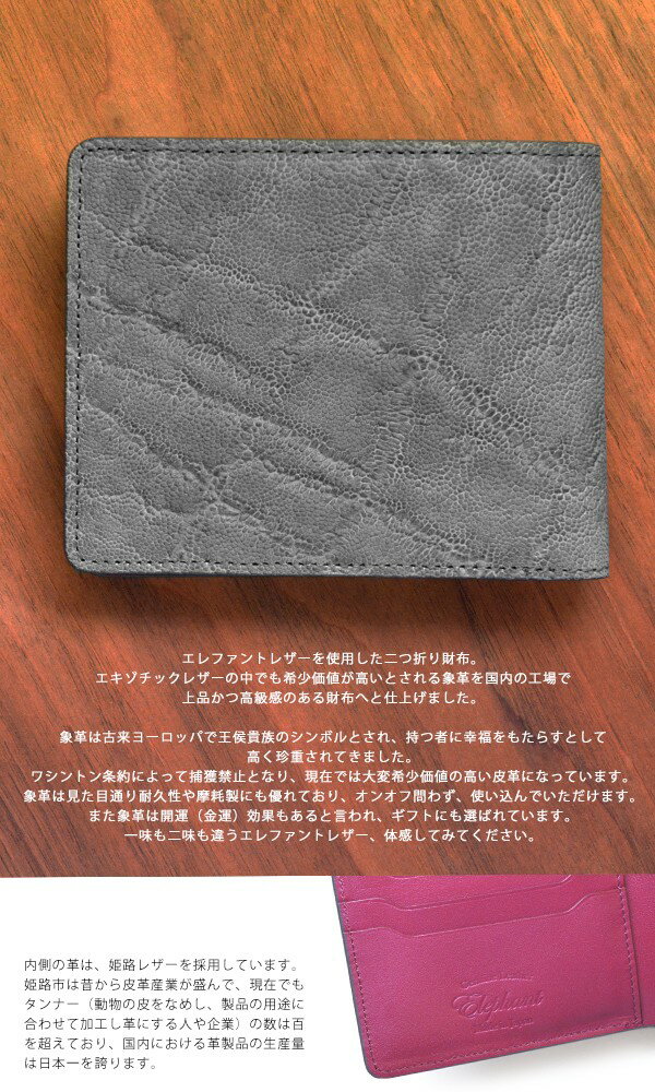 ■素材 ・アウター:象革 ・インナー:姫路レザー(牛革) ■サイズ:H9.5×W11×D2cm ■収納 ・小銭入れ×1 ・札入れ×1(仕切りあり) ・カード入れ×3 ・フリーポケット×2 ■カラー ・グレー×パープル ・ブラウン×チョコレート ・ブラック×レッド ■生産:日本製