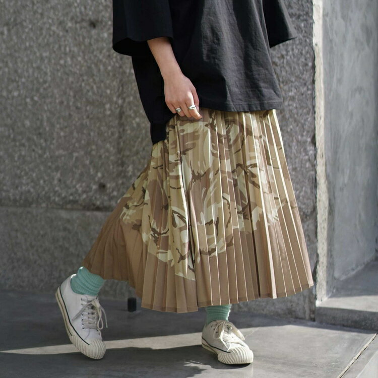 迷彩プリントと無地部分にプリントを入れて、プリーツに切り替を入れているように見せている点がポイントのスカート☆