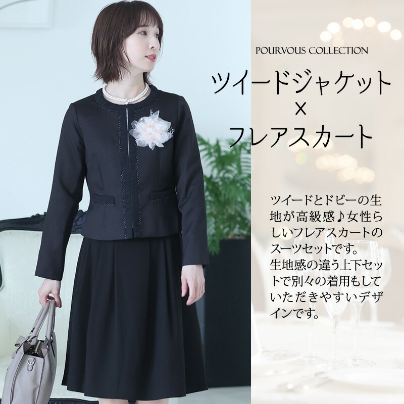 歩く度に揺れるスカートがとっても可愛い 生地感の違う上下セットで別々の着用もしていただきやすいデザイン ツイードとドビーの生地が高級感♪