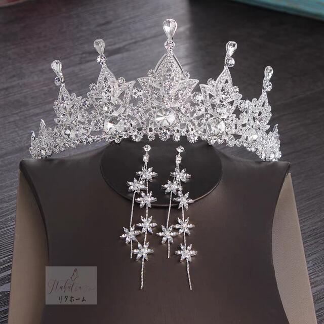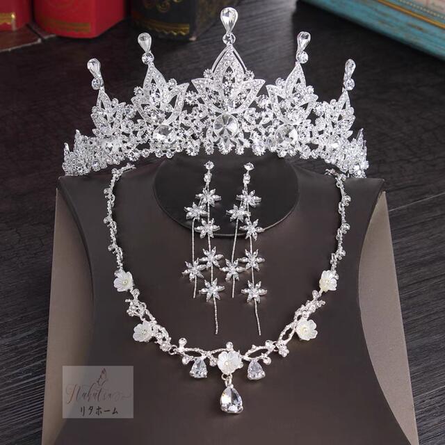 【素材】 クリスタルメッキ、ラインストーン【内容】ティアラ×1、ネックレス×1、イアリング×1対(ピアスタイプも可能、どちらかご指定いただけます。