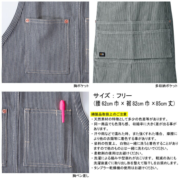 商品説明●関連商品※10121エプロン(首かけ)●オールシーズン用●混率:綿100%●タフ素材、優れた吸汗性、胸ポケット、多収納ポケット、胸ペン差し、肌触りが良く吸湿性のある綿 100%ヒッコリーストライプを使用●サイズ:腰62cm巾×裾82cm巾×85cm丈商品仕様DIY にも最適!気軽に使えるおしゃれエプロン。