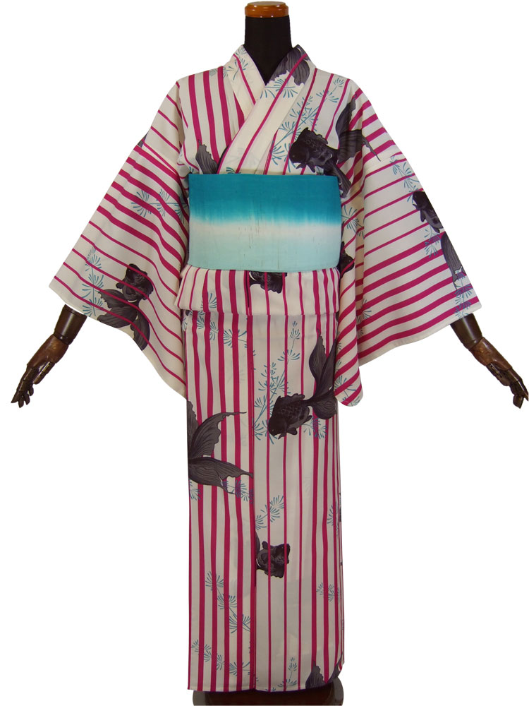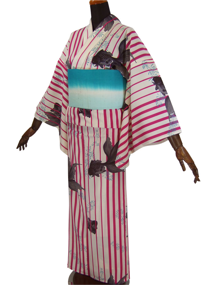 【撫松庵】仕立て上がり浴衣・プレタ浴衣(セオα)「金魚に縞(ローズ)」【10P03Sep16】