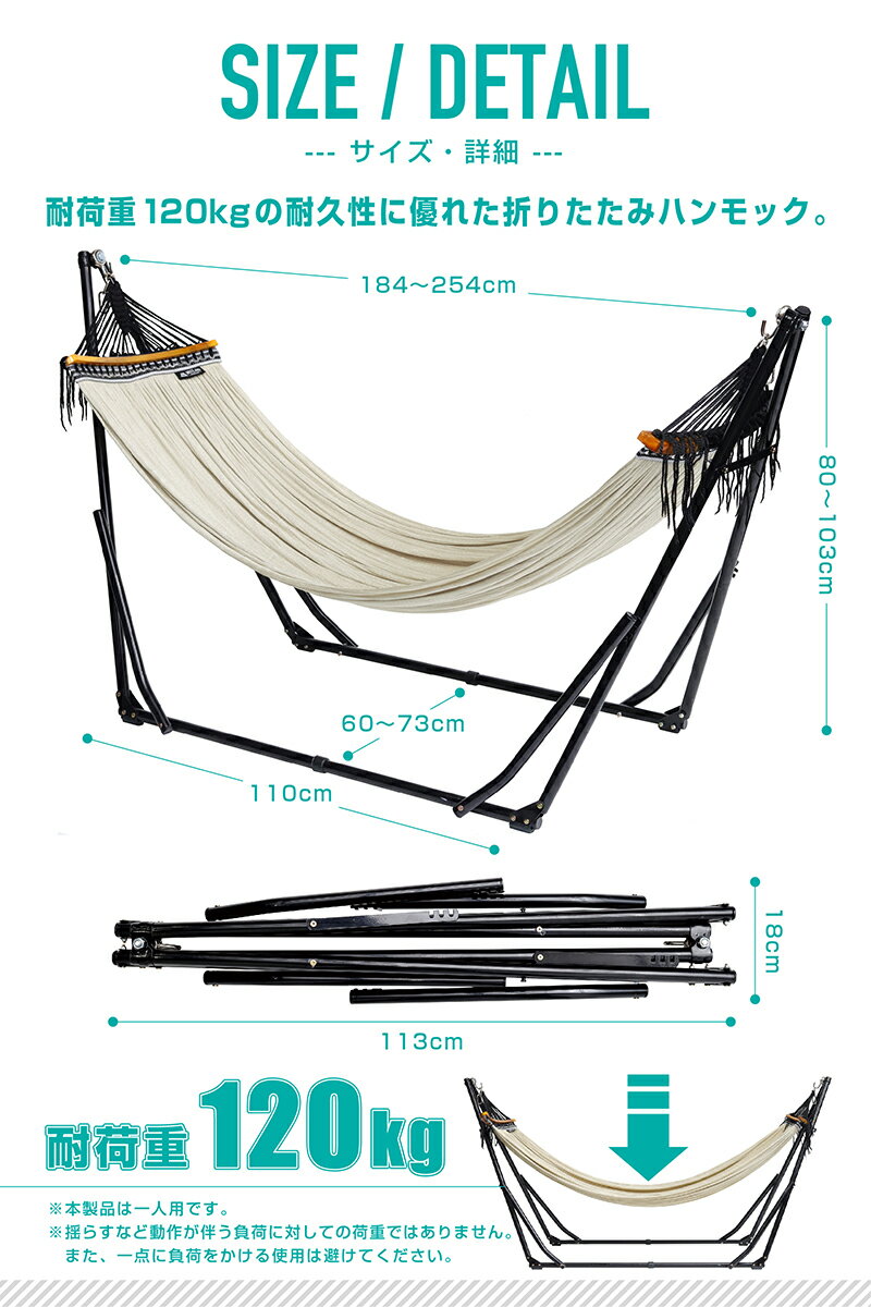 ※日曜休業日 仕様・特徴 ◎サイズ:約254×73×103cm(最大) ◎重量:約8.5kg ◎耐荷重:120kg ◎材質:スチール、ポリエステル、天然木 ◎カラー:黒×ブラウン、黒×アイボリー、茶×ブラウン、茶×アイボリー ◎セット内容:本体、収納袋 ◎使用シーン:キャンプ、海、山、川、公園、庭、室内 商品説明 雲に乗っているような寝心地でゆったりと休むことができる自立式ハンモックです。