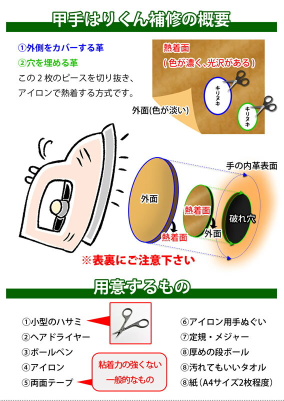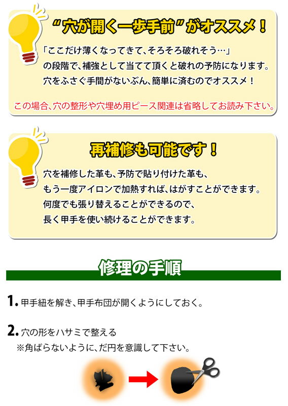 手の内革の穴や破れを、自分で簡単に補修・強化することが出来ます。