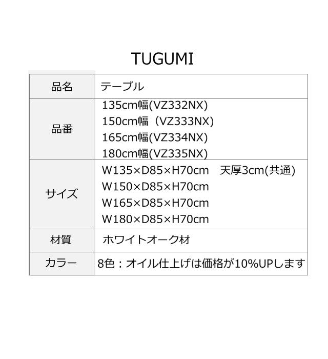飛騨産業 TUGUMI VZ335NXテーブル ホワイトオーク材 【サイズ】:W180×D85×H70cm 天厚3cm 主材:ホワイトオーク材 ポリウレタン塗装 WO、OU、N5、C4、DU、UW、WD,BK色、OF(オイル仕上げ)、からお選びください。