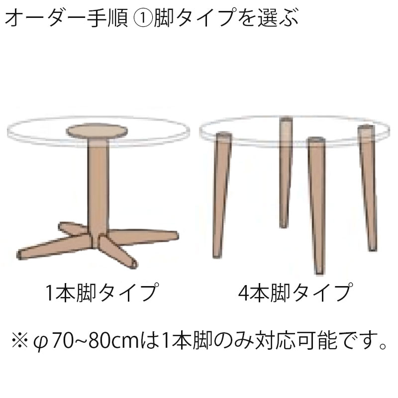 脚のタイプは一本脚(天板サイズ70〜80cm)か、先に行くほど細くなる形状の丸テーパー脚(4本脚・天板サイズ85〜120cm)の2種類からお選びいただけます。